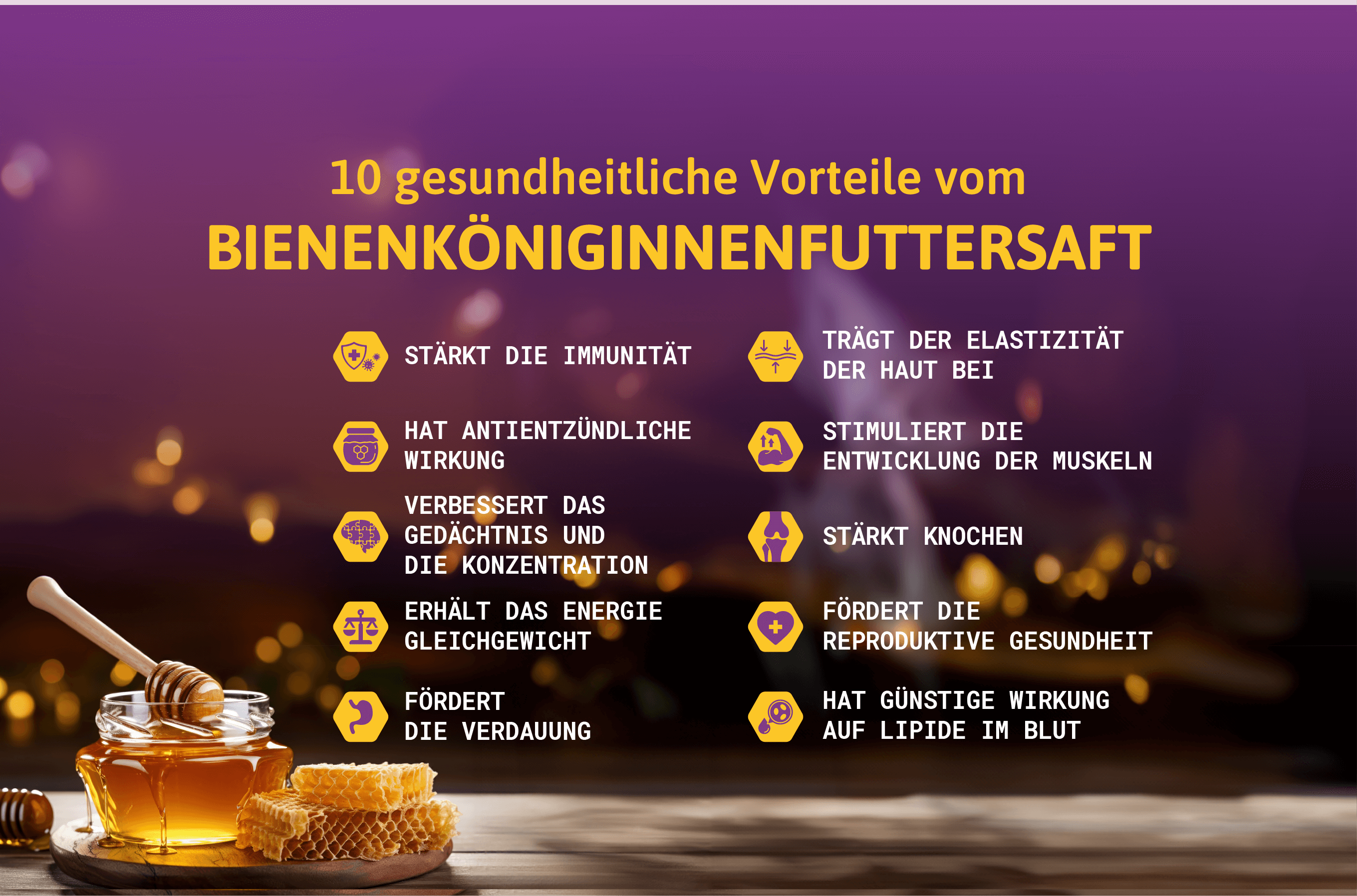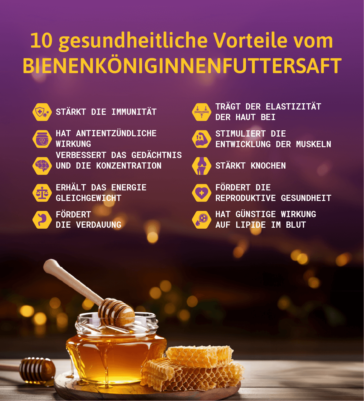 Von alters her benutzt der Mensch Bienenprodukte zu verschiedenen Zwecken, aber eine besondere Bedeutung haben diese Naturschätze für die Prävention und Erhaltung der Gesundheit, Vitalität und Langlebigkeit des menschlichen Organismus. Bienenköniginnenfuttersaft ist ein natürliches Bienenprodukt, eines der sechs, nebst Honig, Propolis, Polen, Wachs und Bienengift. Es enthält mehrere Verbindungen, sehr wichtig für die regelrechte Funktionsweise des menschlichen Organismus und stellt die natürliche Stütze für die Immunität dar. In diesem einzigartigen natürlichen Produkt befindet sich: Mischung von Aminosäuren, Vitaminen (besonders B Komplex), Lipiden, Fettsäuren, Kohlenhydraten, Enzymen, Mineralstoffen.